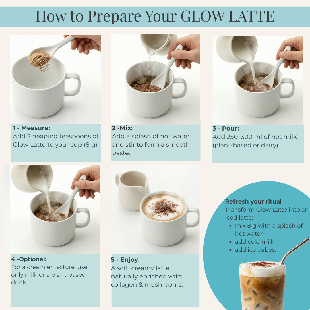 Ajoutez 2 cuillères à café bien bombées (8 g) de Glow Latte dans votre tasse. Versez un peu d'eau chaude et mélangez, puis complétez avec 250 à 300 ml de lait chaud, végétal ou classique. Pour une texture encore plus onctueuse, vous pouvez utiliser uniquement du lait. Glow Latte se déguste également en version glacée : mélangez 8 g de poudre avec un peu d’eau chaude, ajoutez du lait froid et quelques glaçons. Savourez un latte doux, crémeux et réconfortant, naturellement enrichi en collagène marin et champignons adaptogènes.