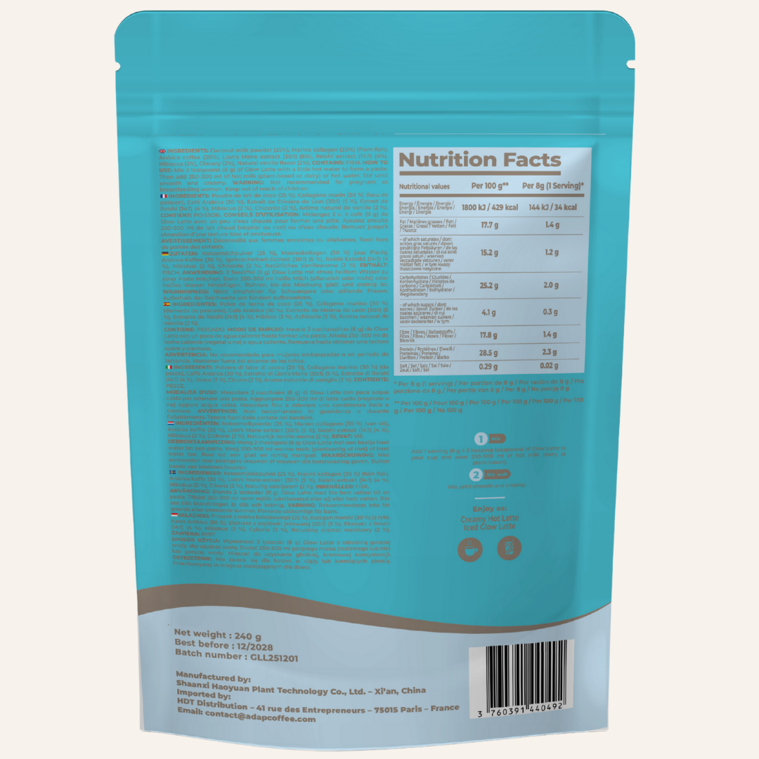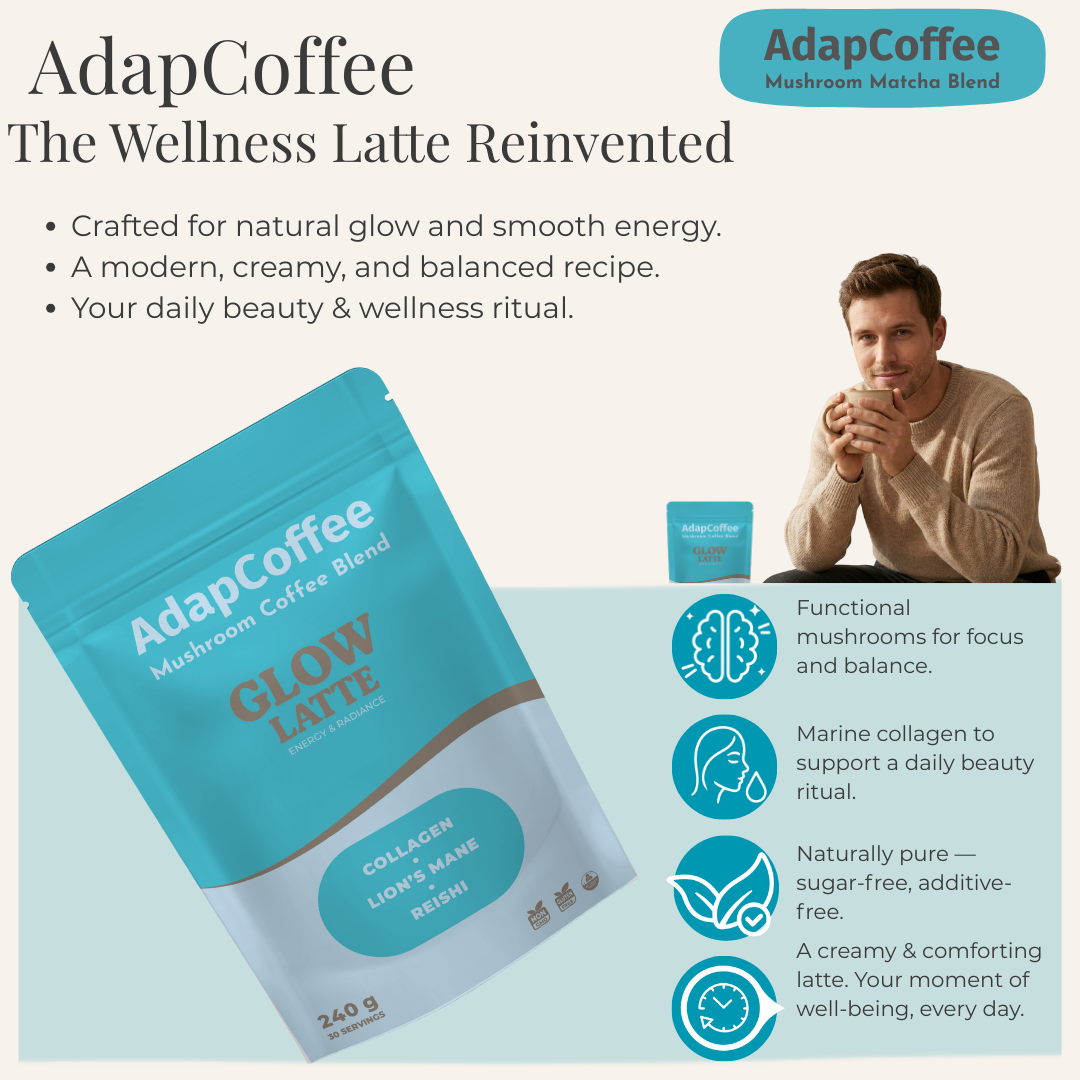 Grâce à son association unique de champignons adaptogènes, de collagène marin et d’ingrédients d’origine naturelle, Glow Latte by AdapCoffee accompagne votre quotidien avec douceur et gourmandise :