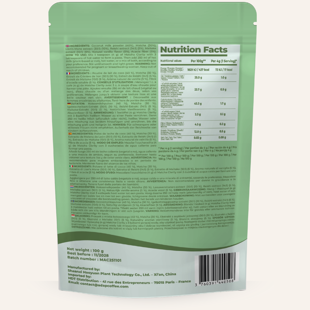 Grâce à son matcha cérémonial et à ses extraits de champignons adaptogènes, Matcha Clarity de AdapCoffee :