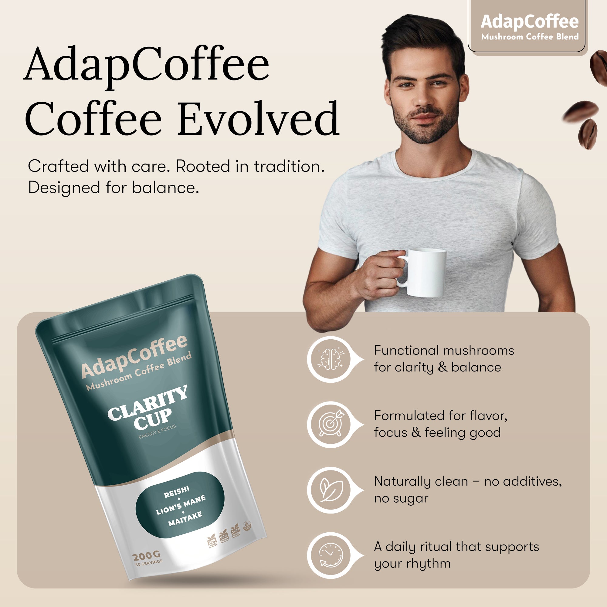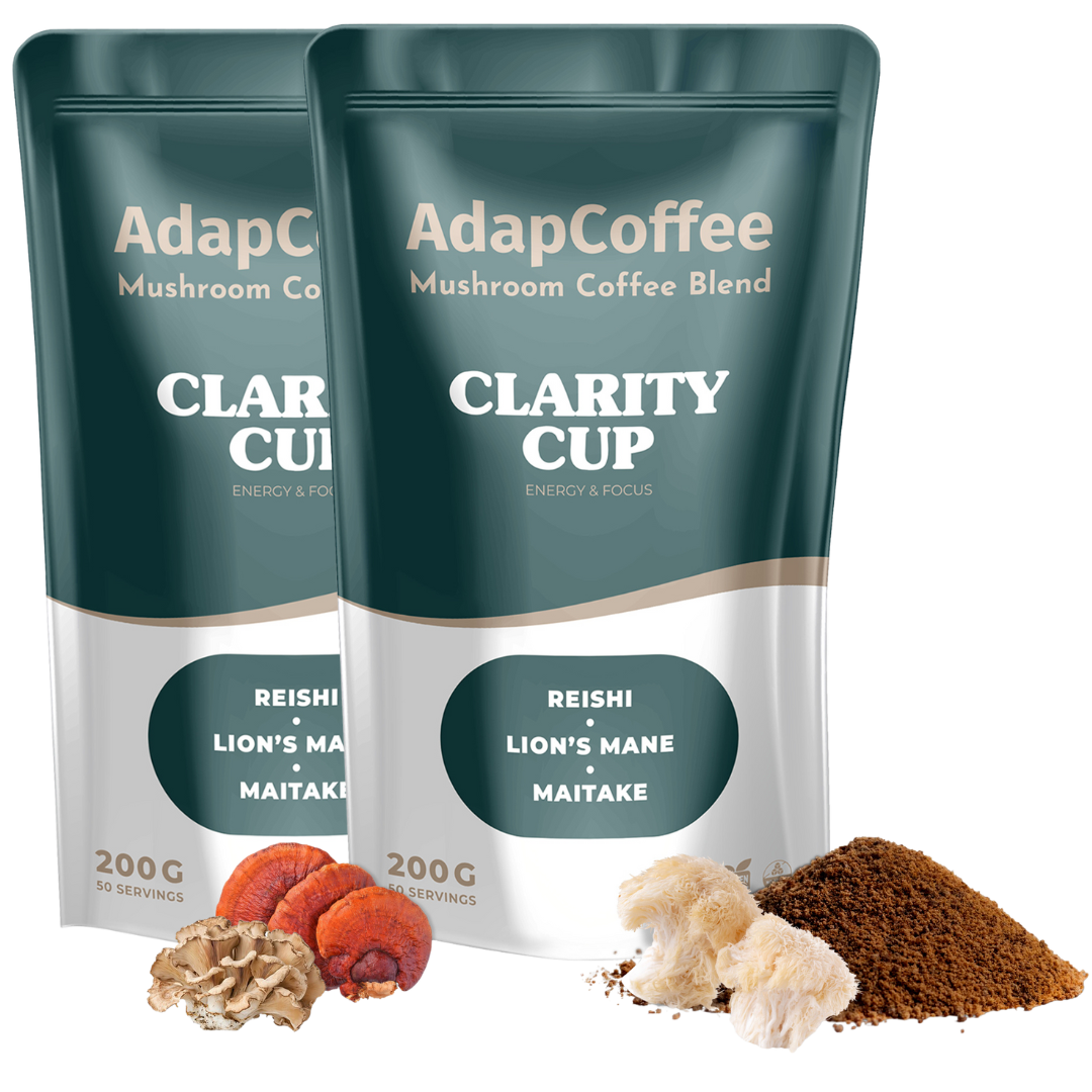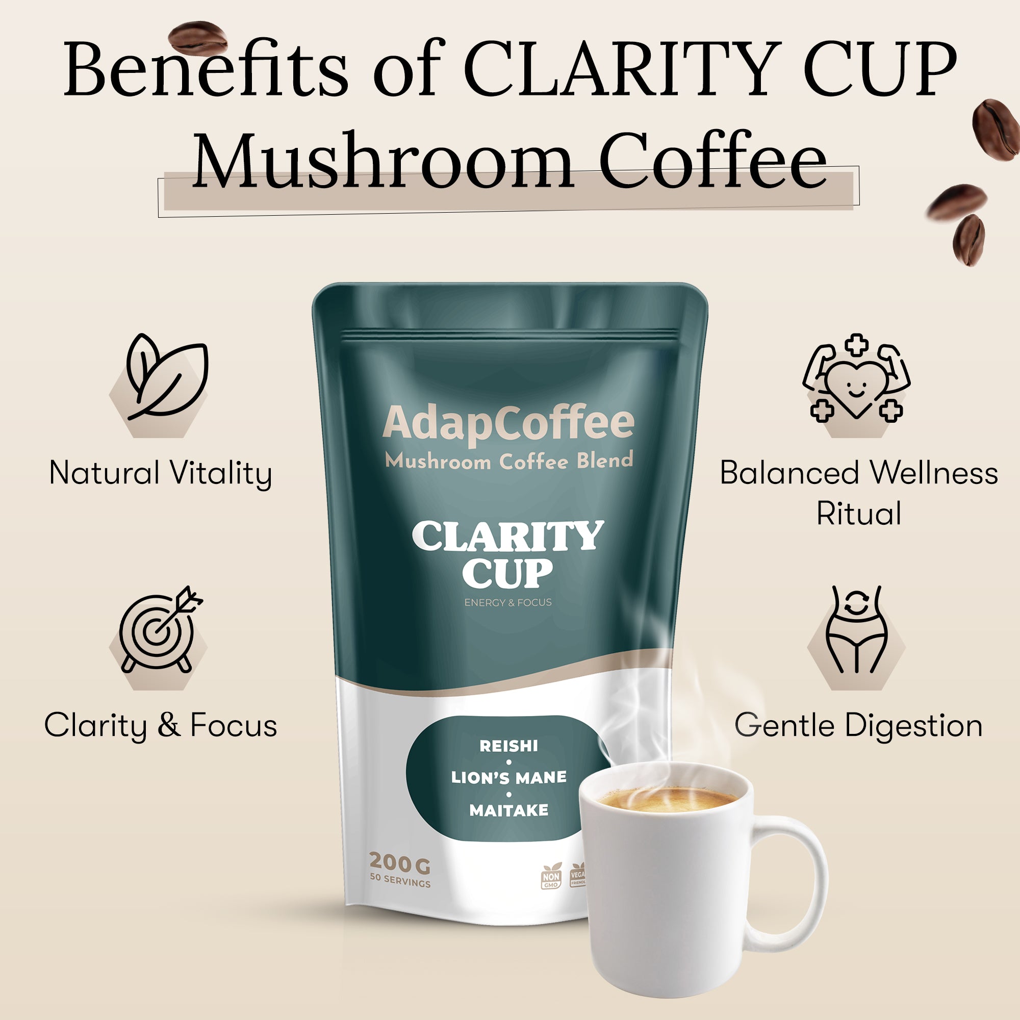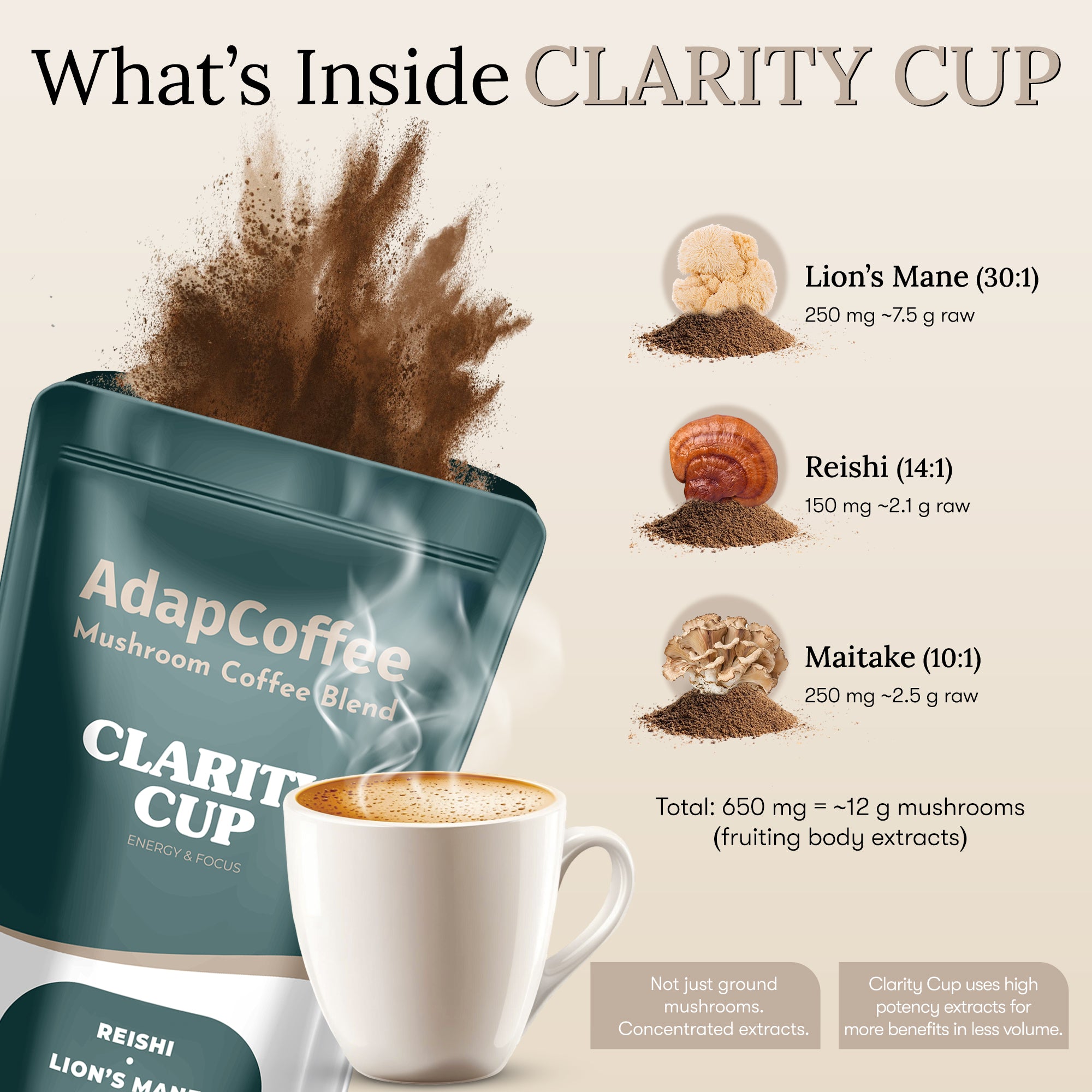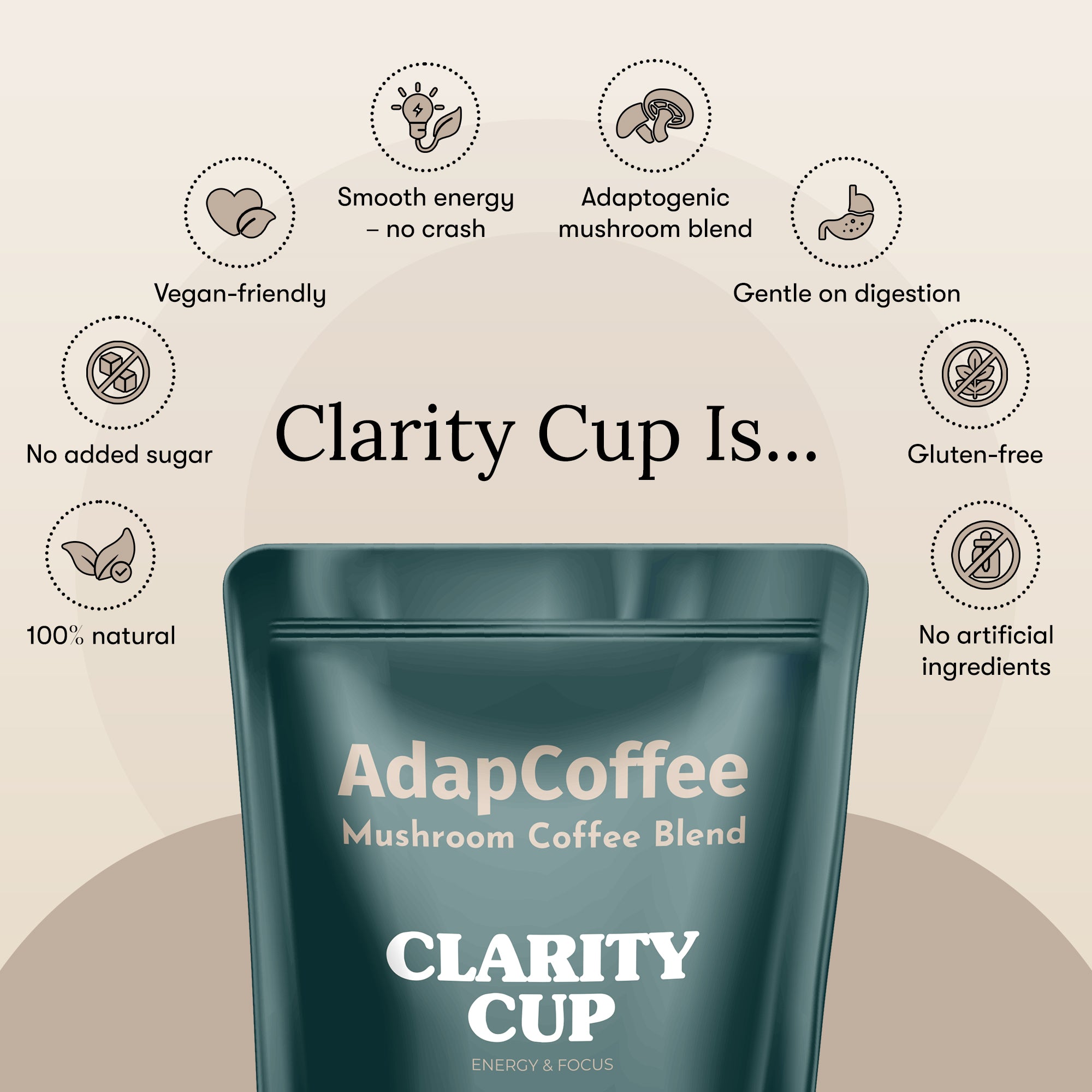 Dankzij de adaptogene paddenstoelenextracten en natuurlijke ingrediënten biedt Clarity Cup van AdapCoffee:
