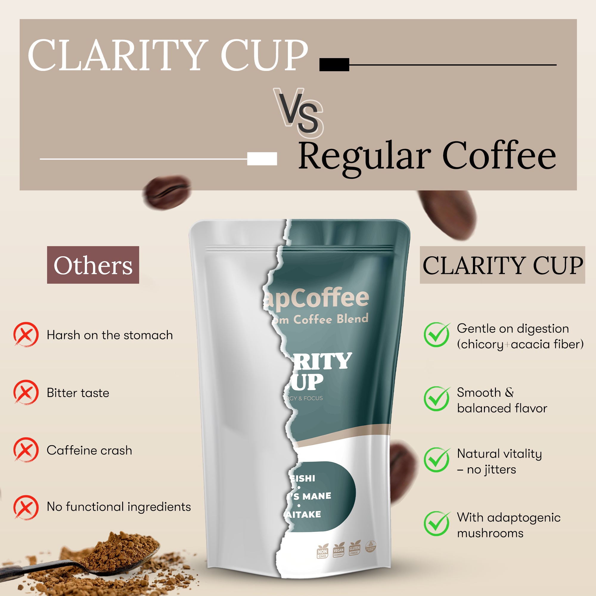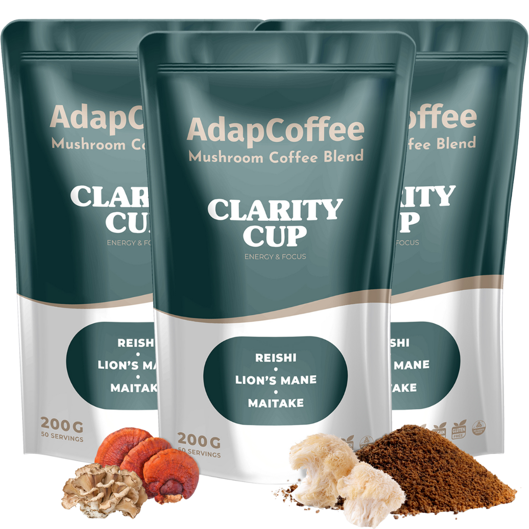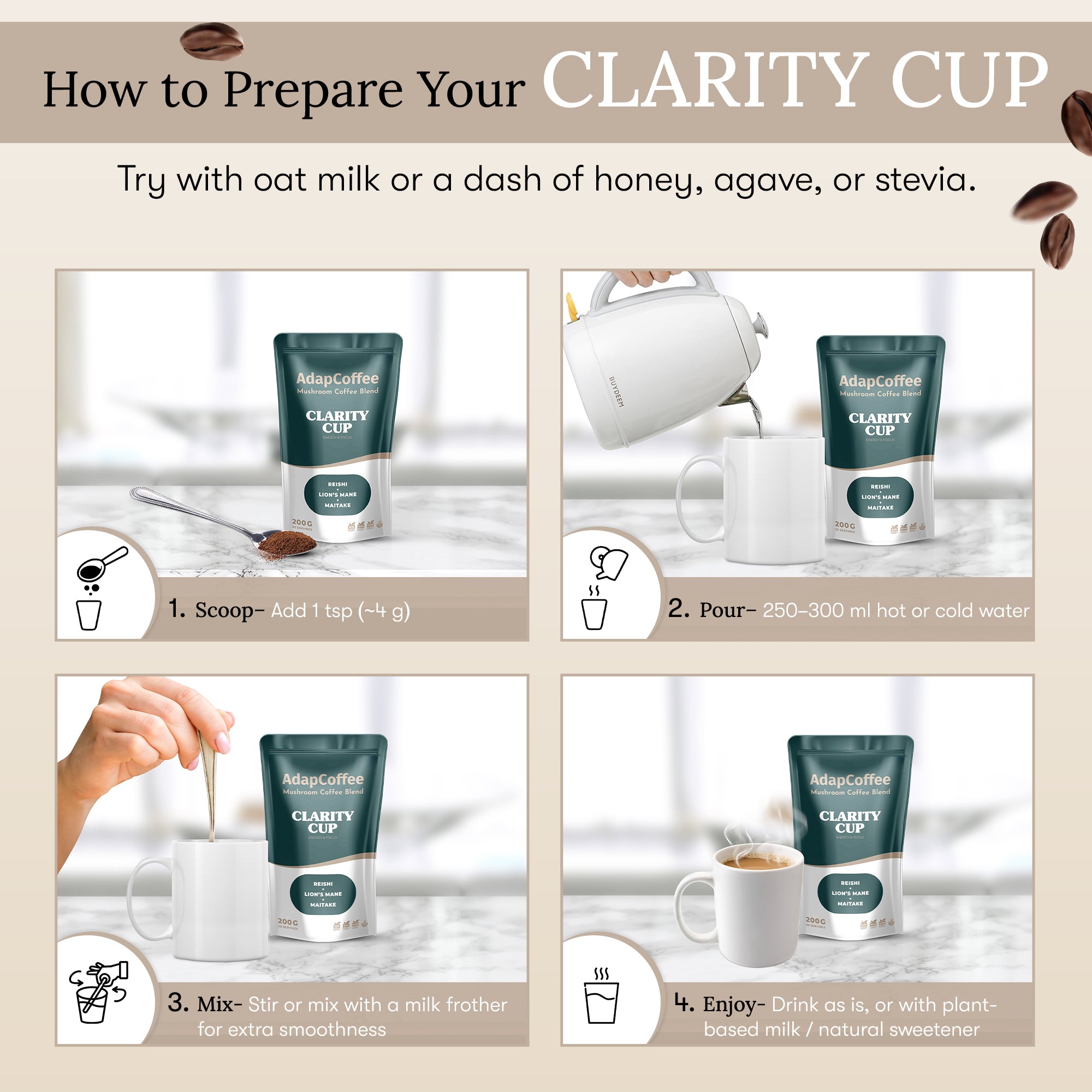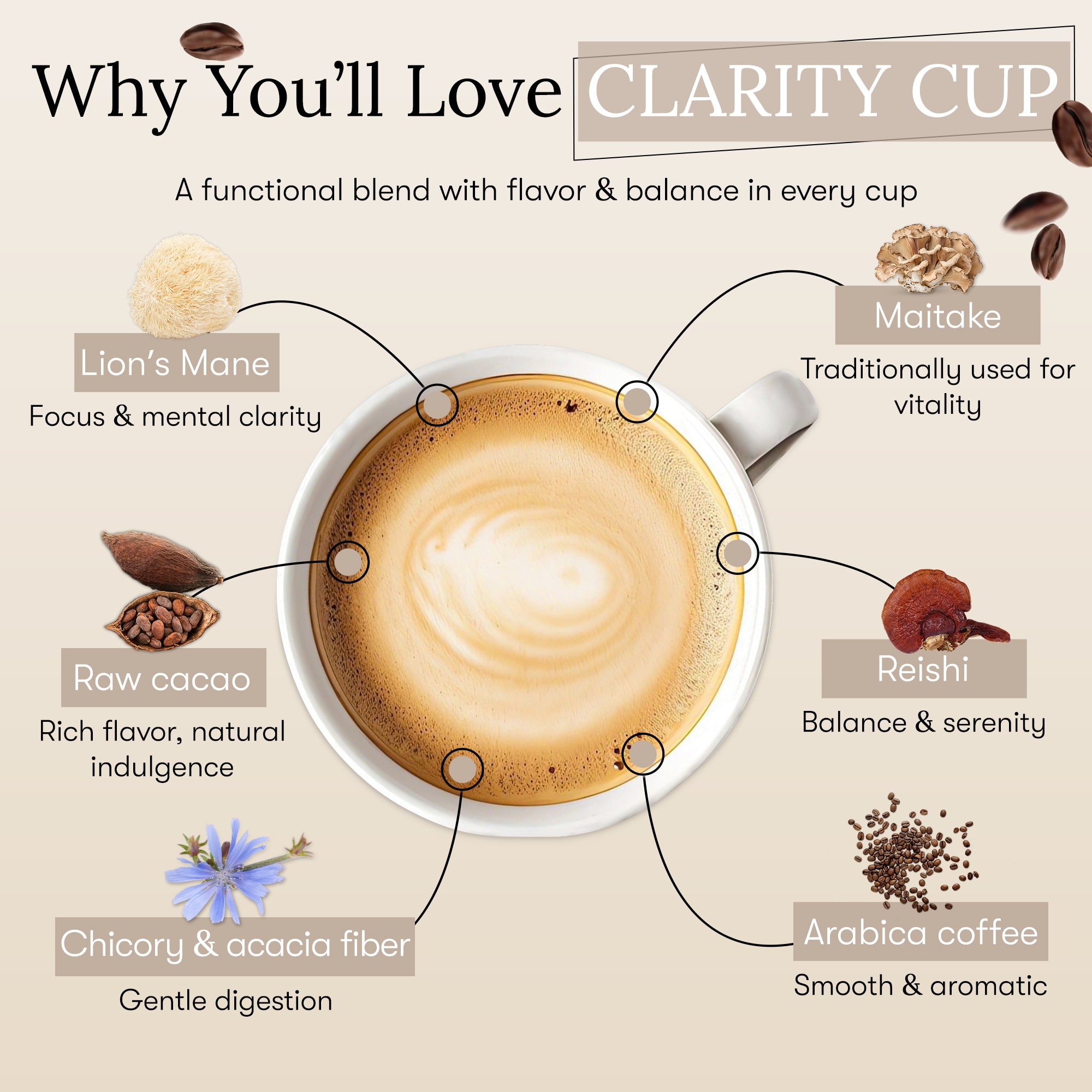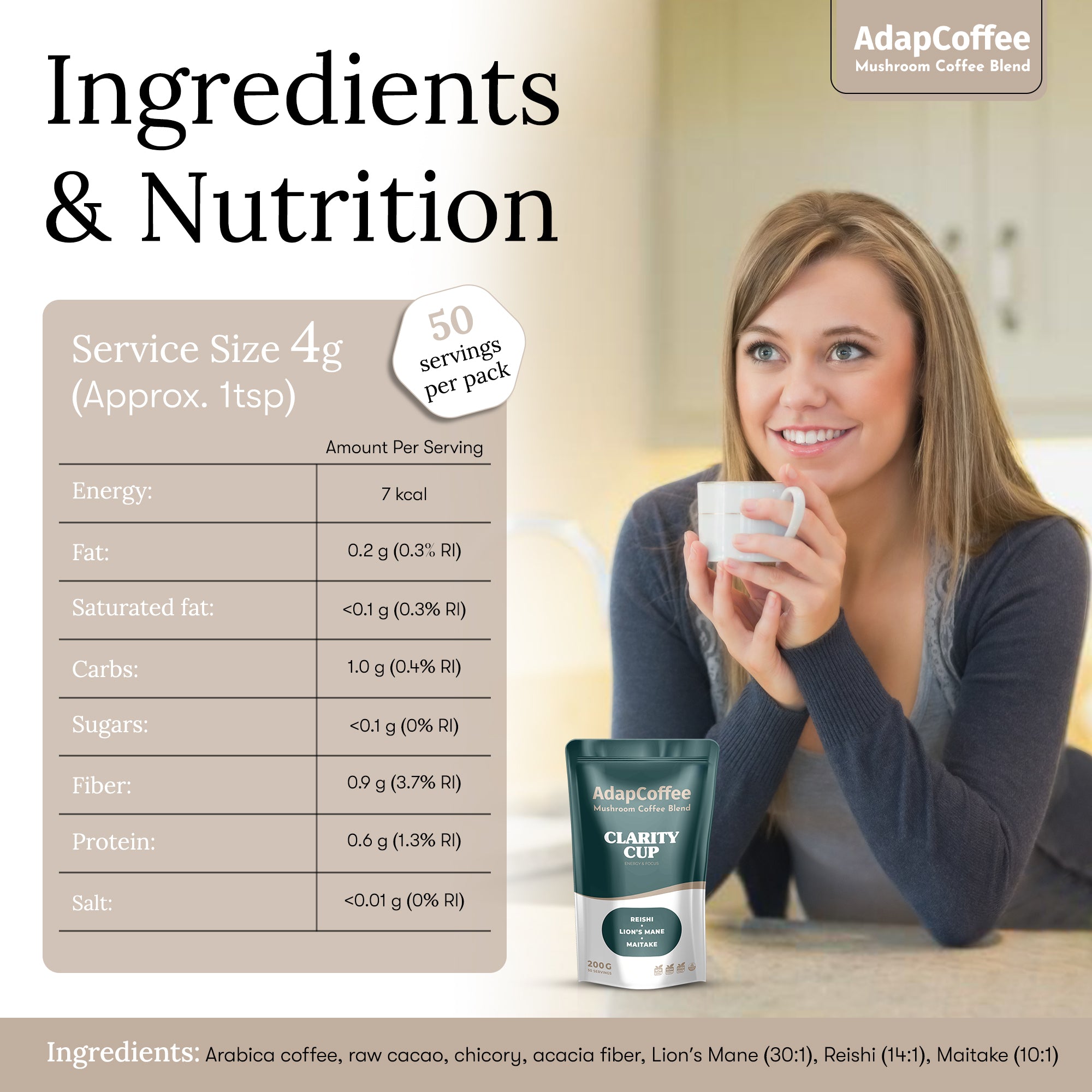 Dankzij de adaptogene paddenstoelenextracten en natuurlijke ingrediënten biedt Clarity Cup van AdapCoffee: